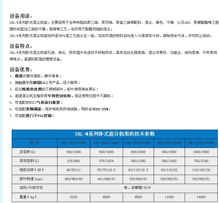 • 張家港市佳諾機械SRL-W高速混合機組技術參數: