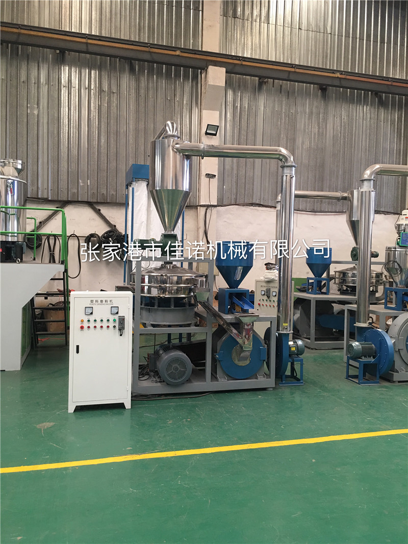 該機工作部分為。高速粒子在撞擊齒板后部分被粉碎,經吸風抽出,而較大粒子則繼續撞擊,粉碎后被抽出。這樣減少了負荷,提高磨粉效率,又能使粉料得到均勻冷卻。 溫度低是該機的主要優點。按熱功當量:每小時作功后轉換為860千卡熱量。本機為外抽風。風量達2602m3/h,由進、出口風溫差,帶走大部分熱量。少部分熱量由水冷卻解決。要求冷水的進口溫度不大于25℃,出口水溫度不大于45℃,夏天適當增加冷卻水流,以降低溫度。 塑料磨粉機設計結構緊湊,體積小耗電低,是在消化吸收國外先進技術設備基礎上,為滿足國內廣大用戶的迫切需要而精心研制成功的,它是加工磨制熱塑性PE、PVC等塑料材料的理想設備。